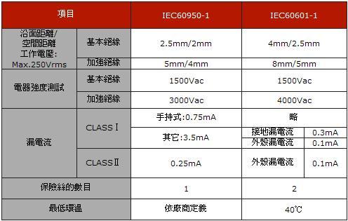 根據(jù)安規(guī)標準,EN60950-1 ClassI最大漏電流不可超過3.5mA;而EN60601-1最大漏電流不可超過0.3mA。量測時各別的安全距離、保險絲數(shù)量多有不同,其相關(guān)差異如下表列: